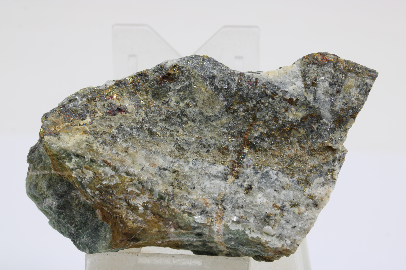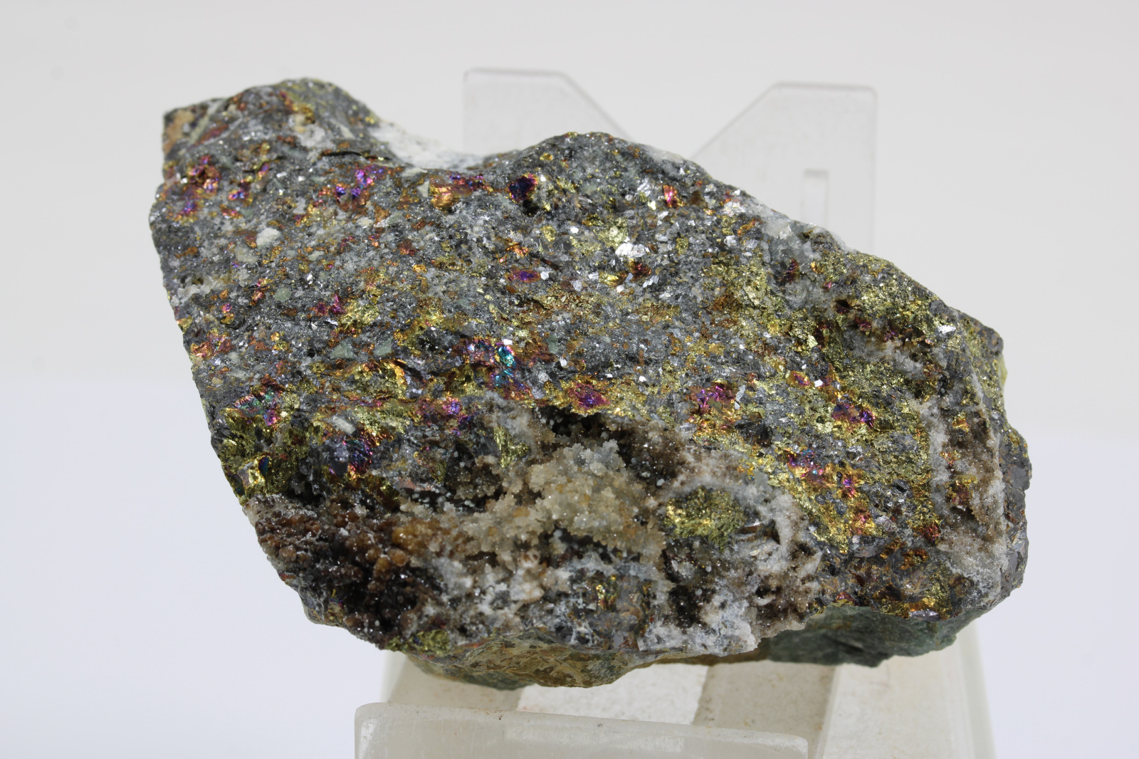 Chalkopyrit s galenitom a hnedožltým sfaleritom, krajina pôvodu je Slovensko - Banská Štiavnica, rozmery vzorky sú cca: 9 x 5 x 4 cm.