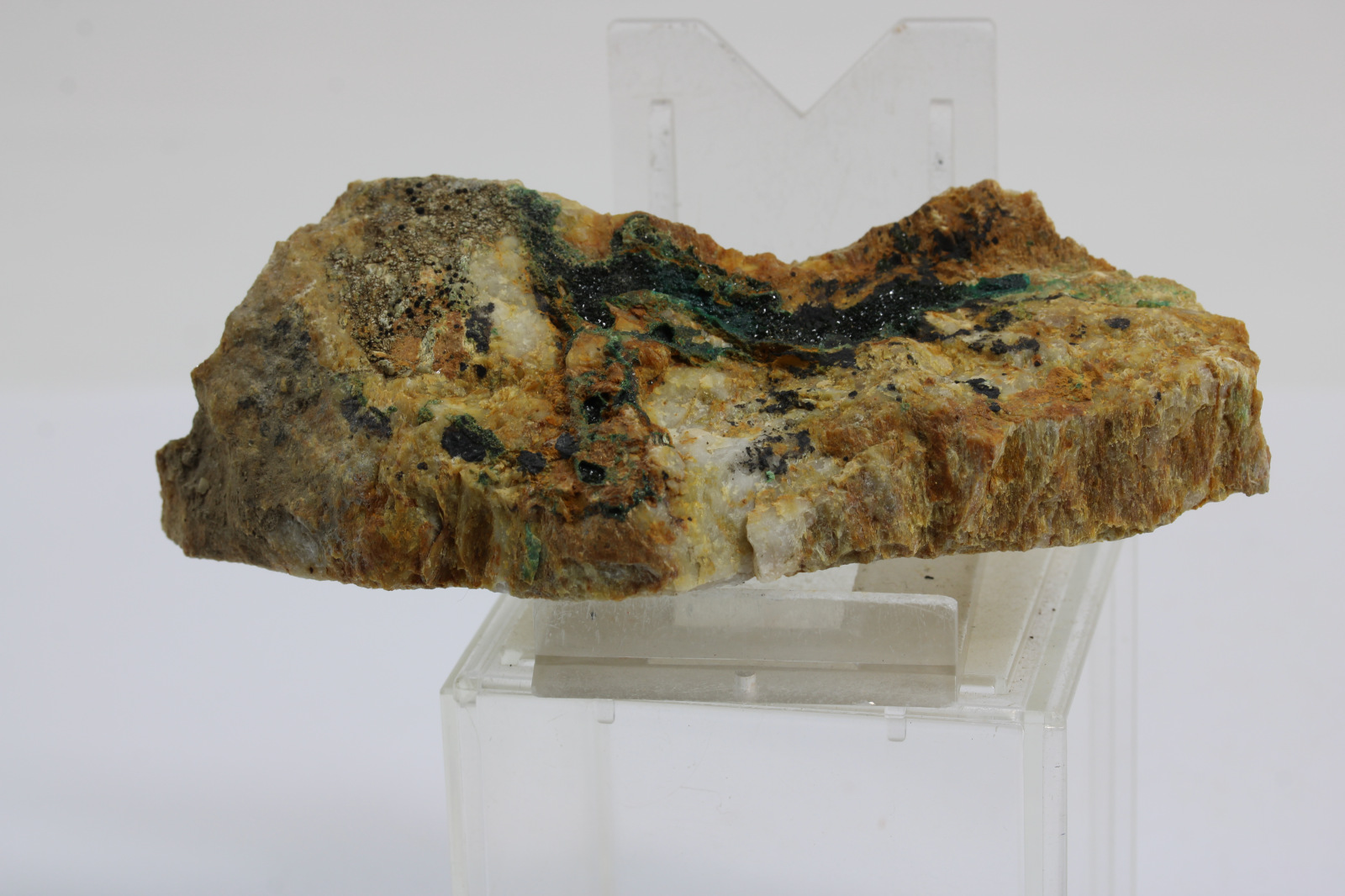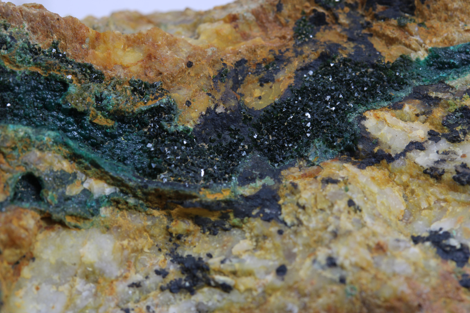 Libethenit, krajina pôvodu je Slovensko - Ľubietová, rozmery vzorky sú cca: 10 x 4 x 4 cm.