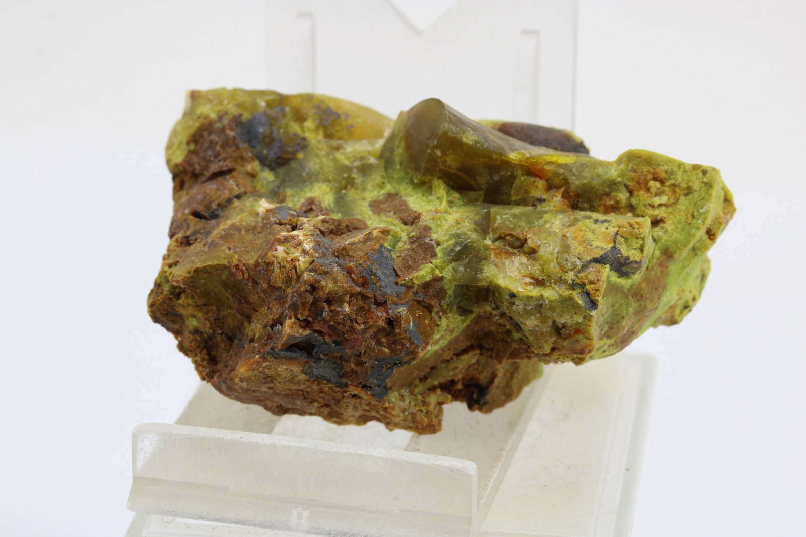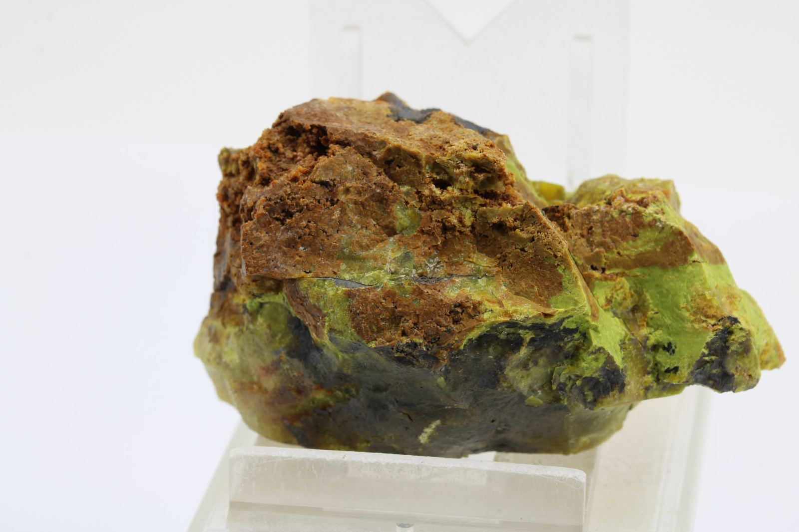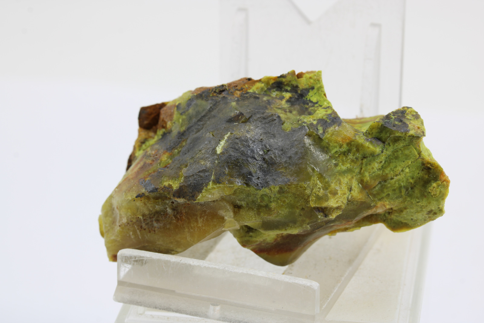 Svetlozelený nontronit v kombinácií s tmavozeleným chlóropálom, krajina pôvodu je Slovensko - Lehota pod Vtáčnikom, rozmery vzorky sú cca: 6,5 x 3 x 4 cm.