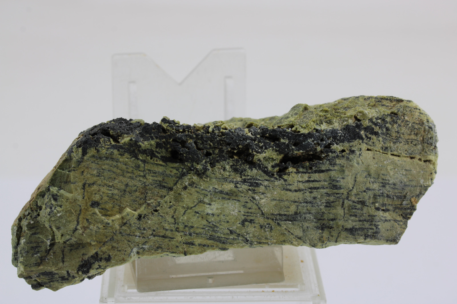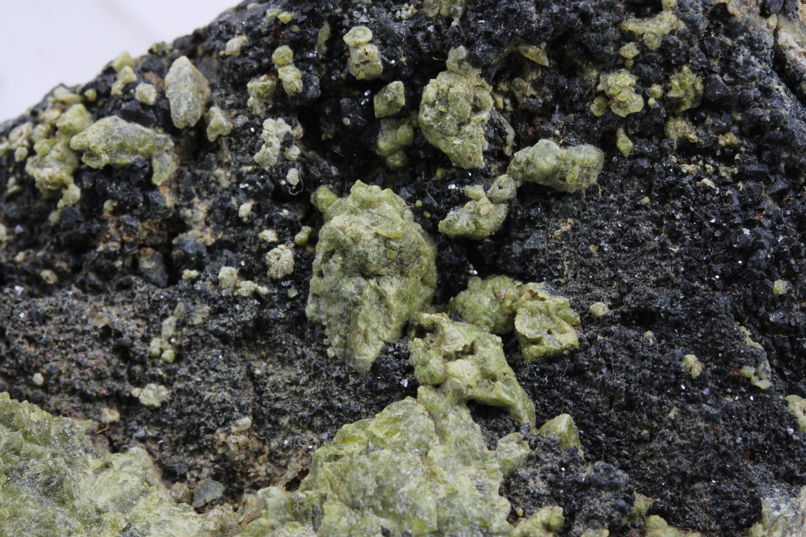 Spinel - odroda pleonast so zeleným augitom - odroda fassait, krajina pôvodu je Slovensko - Hodruša - Hámre, rozmery vzorky sú cca: 9 x 7 x 3 cm.