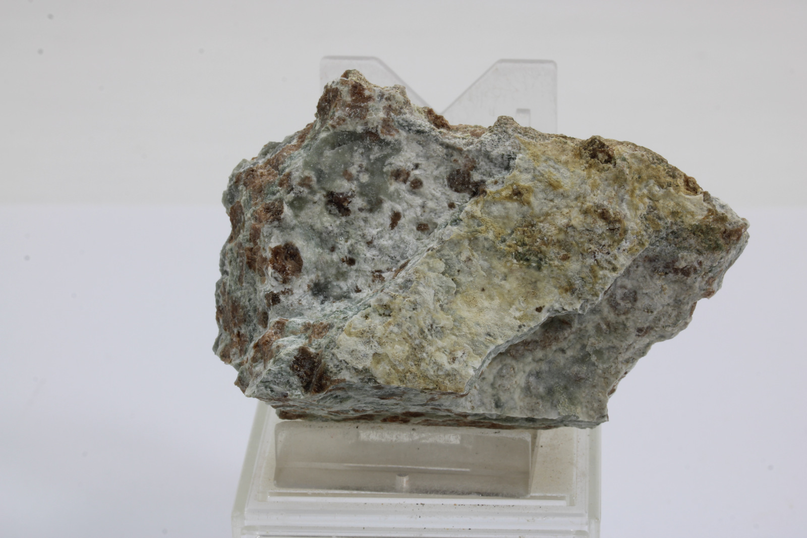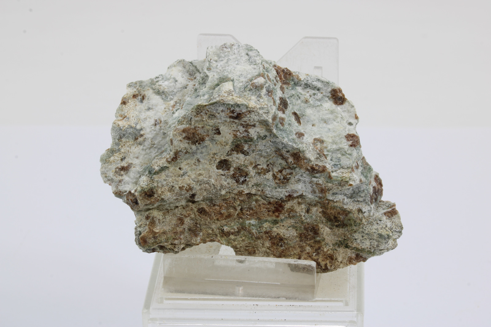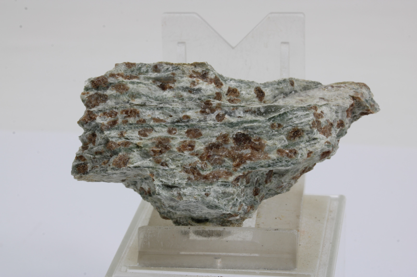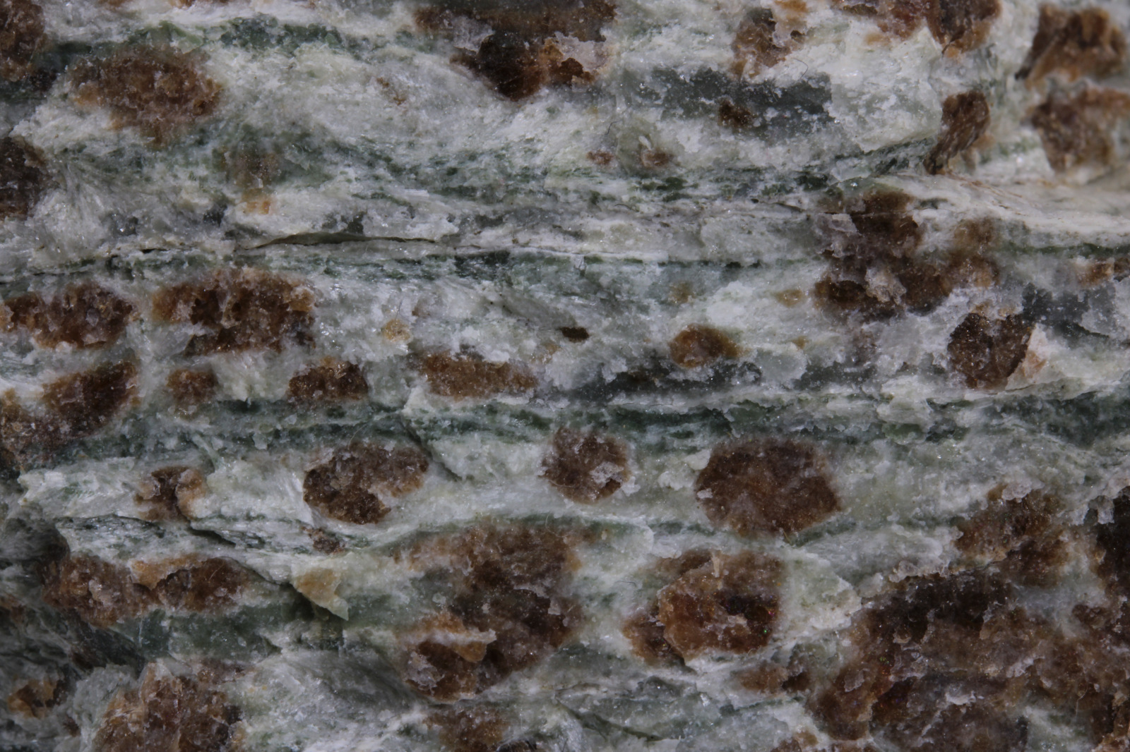 Biely, lúčovitý wollastonit s bledohnedým grossulárom v diopside, krajina pôvodu je Slovensko - Dubová, rozmery vzorky sú cca: 7 x 4 x 3 cm.